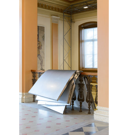 Kilian Rüthemann setzt sich stets mit der gegebenen Situation eines Ausstellungsortes auseinander, untersucht dessen räumliche Qualitäten und greift durch präzise Interventionen ins vorhandene architektonische Gefüge ein. Linger! (2012) besteht aus vier übereinander gelegten Blechkörpern, die nicht nur in ihrer Form Matratzen ähneln, sondern sich auch in ihrer Statik wie Matratzen verhalten. Trotzdem sind sie starr. Über dem Treppengeländer im repräsentativen, neoklassizistischen Foyer des Kunstmuseums liegend, bildet das Werk eine heftige Geste, evoziert die Matratzenähnlichkeit doch Weichheit und Leichtigkeit, die hier jedoch mit der herkömmlichen Härte und dem Akt des Zurechtbiegens des Materials konfrontiert werden.