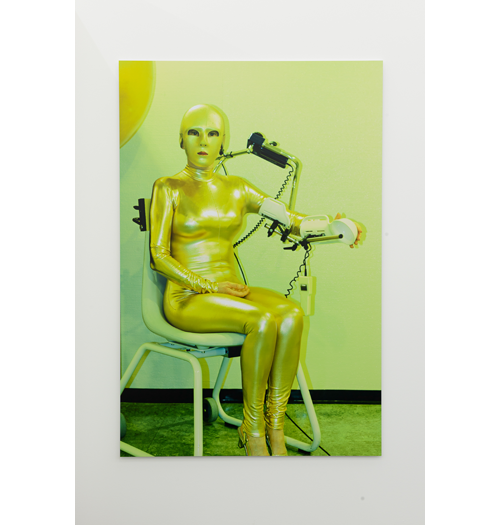 Manon – eine der ersten und renommiertesten Performance-Künstlerinnen der Schweiz – ist bekannt für ihre seit 1974 entstehenden Environments, in denen sie sich selbst, Statisten sowie moderne Medien in verschiedenen Rollen präsentiert und sich intensiv mit Themen wie Vergänglichkeit, Erotik und Gender auseinandersetzt. Auch in der hier ausgestellten inszenierten Fotografie Zimmer 14 (2012) präsentiert sie sich in einer ungewohnten Rolle. Inspiriert ist das Werk von einem sechswöchigen Krankenhausaufenthalt in einem Zimmer mit der Nummer 14, in dem sie nach einer Schulteroperation täglich in den abgebildeten 'elektrischen Stuhl' sitzen musste.